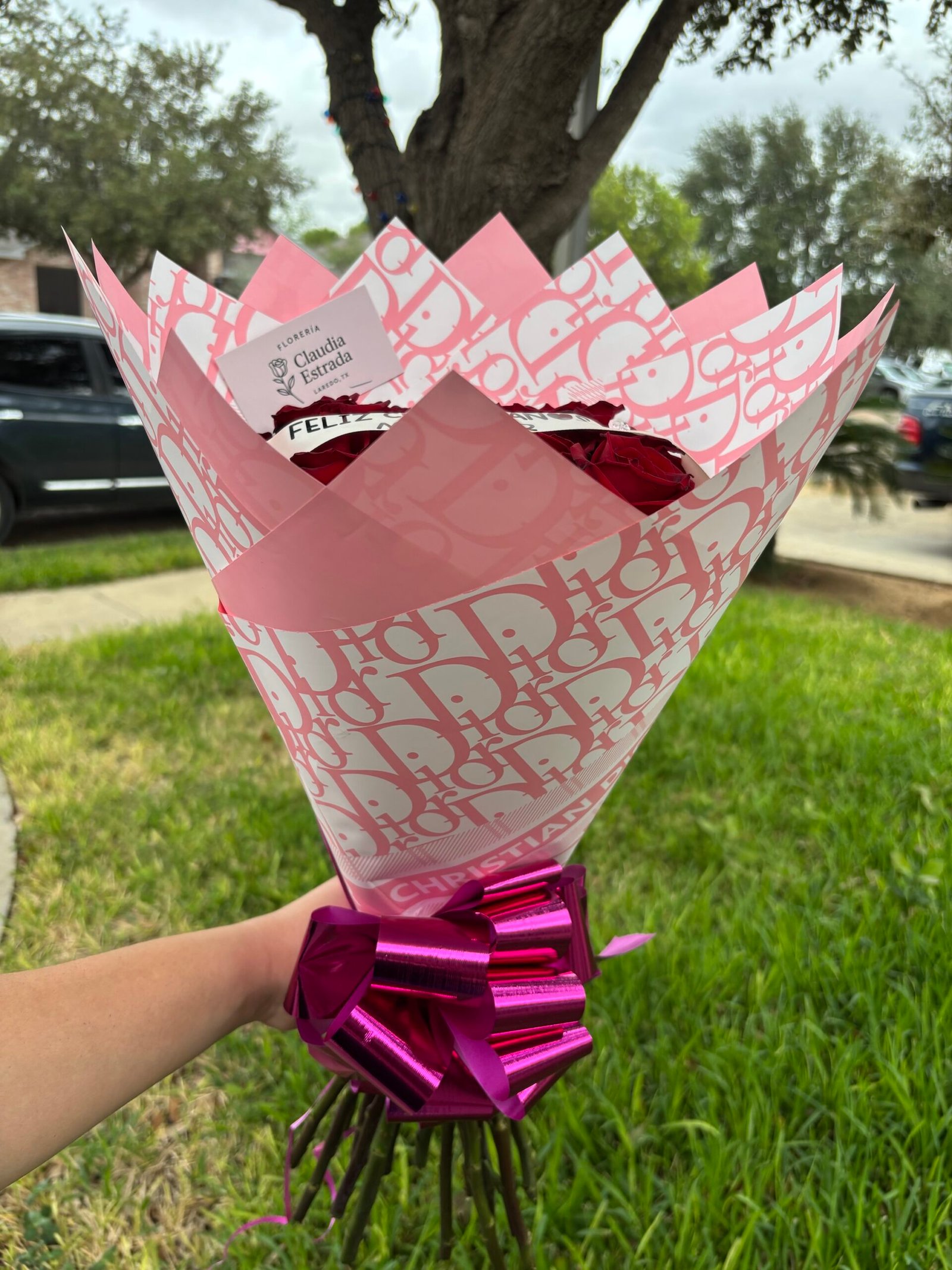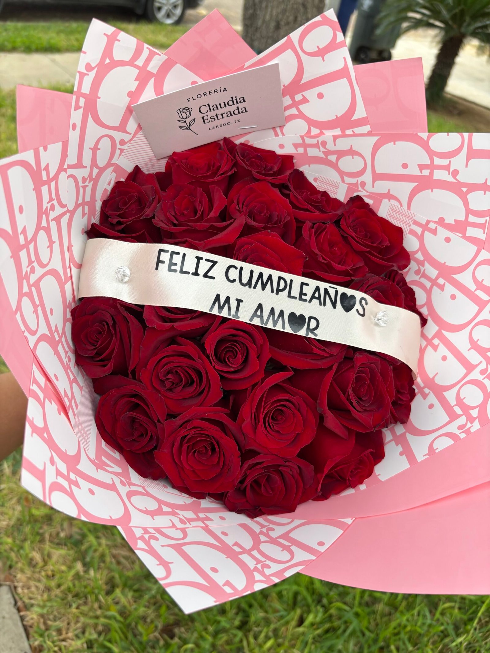 Agrega flores blancas alrededor para dar un mayor volumen a tu ramo y personaliza 100% tu listón con el texto de tu preferencia .