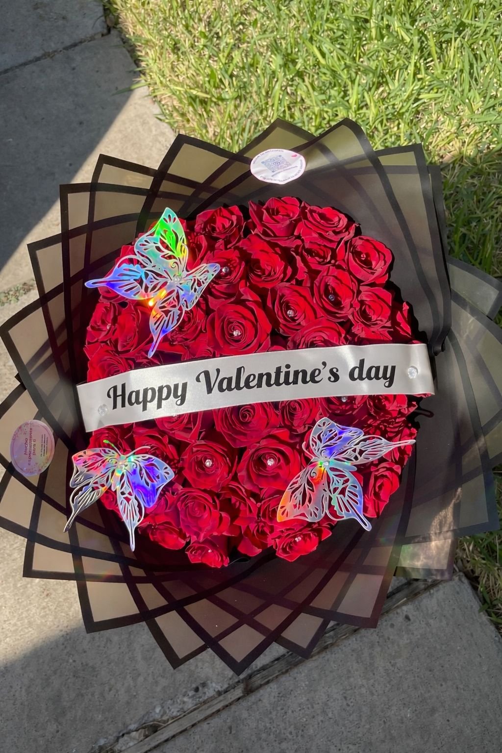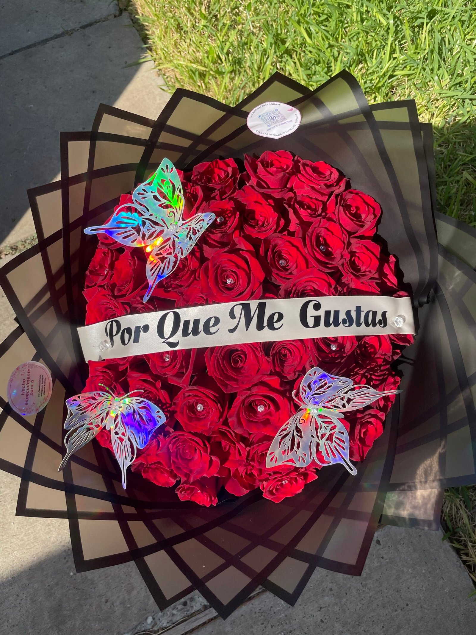 Este bouquet destaca por sus elementos únicos: un delicado listón decorado con mariposas y resplandecientes diamantes. Estos detalles no solo embellecen el arreglo, sino que también lo convierten en un regalo irrepetible cargado de significado y estilo.