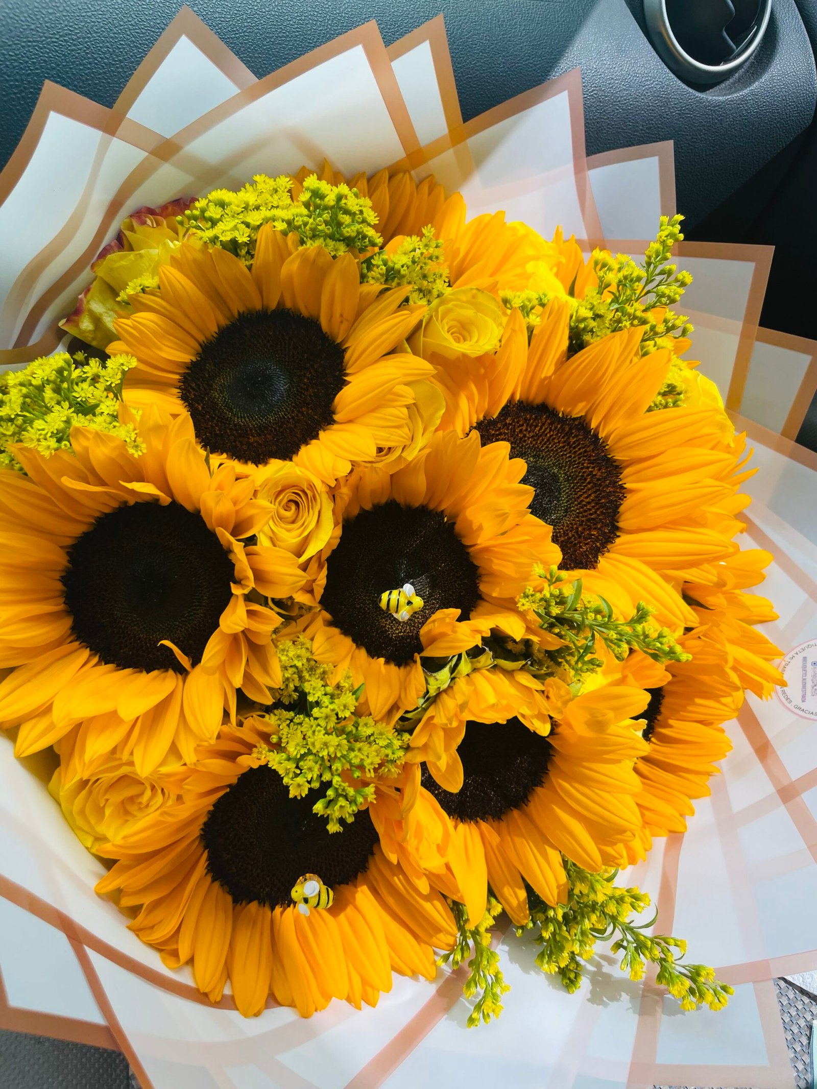 Hermoso bouquet de 10 girasoles con flores y follaje. Sorprende e ilumina su día con este ramo 🌻.